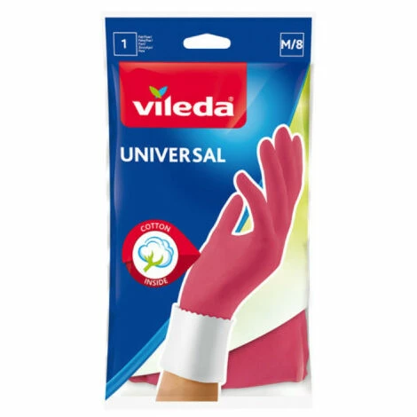 Präsentation : Dieses Paar VILEDA Universalhandschuhe – Gröe M wird Ihre Hände beim Putzen angemessen schützen. Wenn Sie Reinigungsmittel verwenden, ist es wichtig, auf Ihre Haut zu achten und den direkten Kontakt mit ihnen zu vermeiden. Diese Handschuhe haben ein Innenfutter aus Baumwolle, das ihre Verwendung viel angenehmer macht. Die Auenseite ist eher klassisch und besteht aus traditionellem Latex.